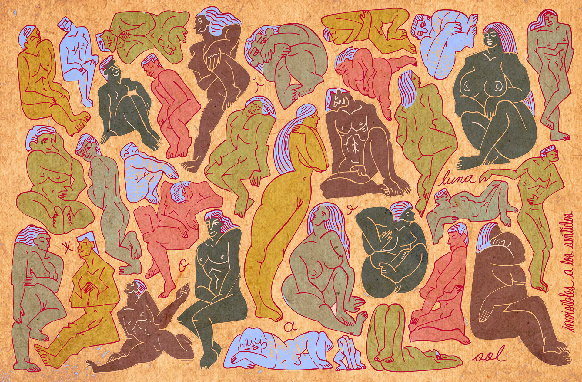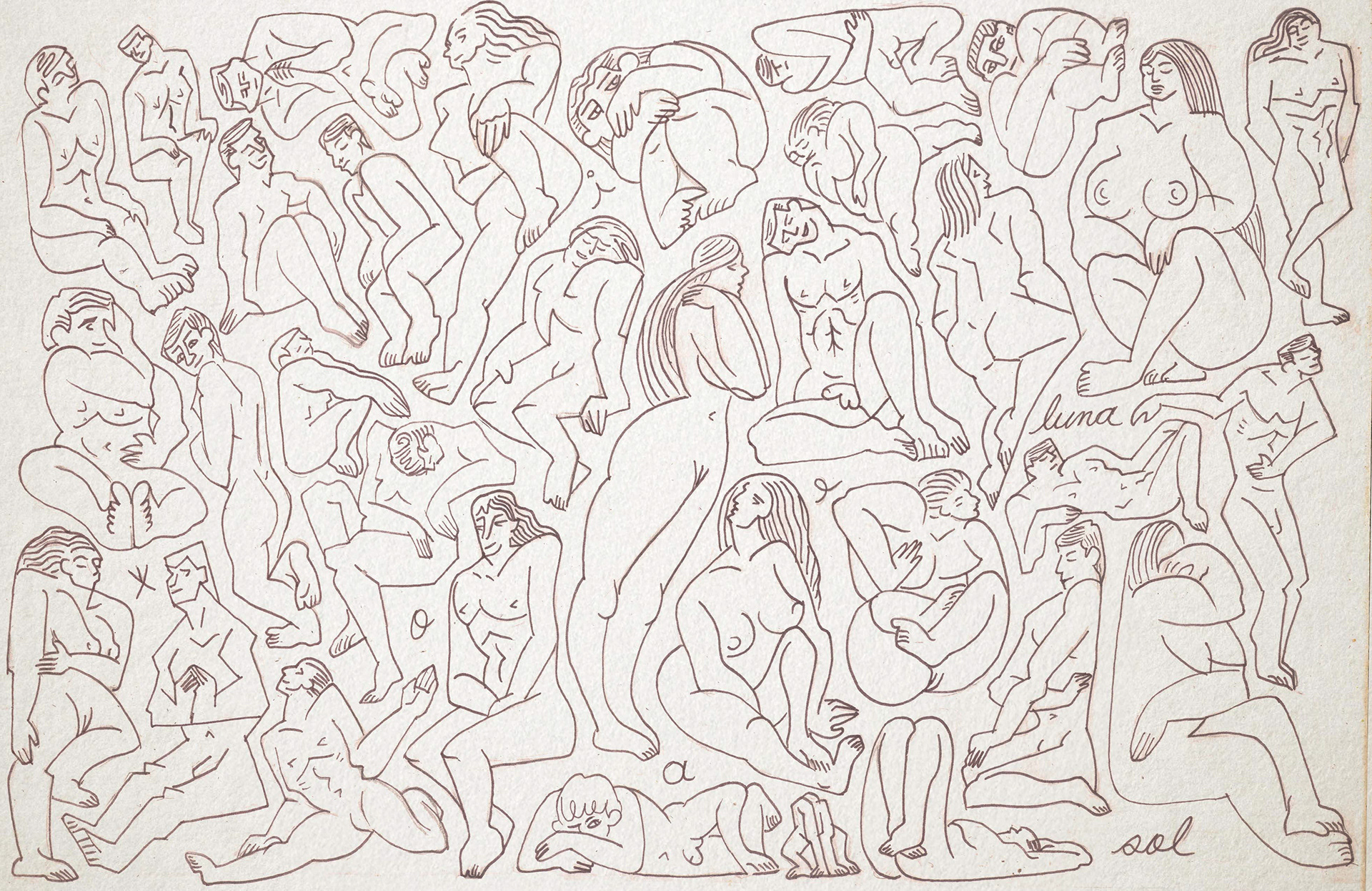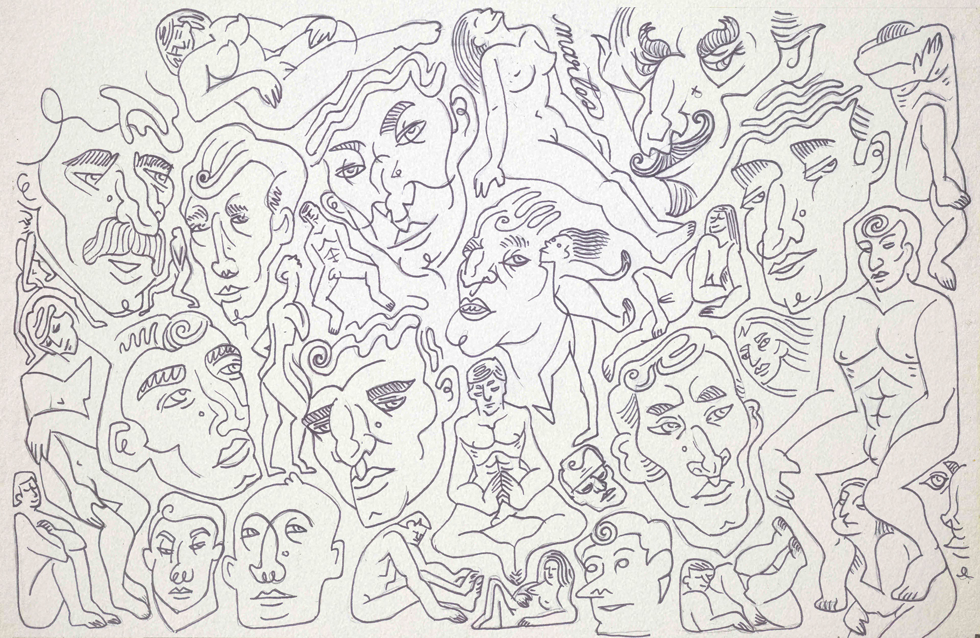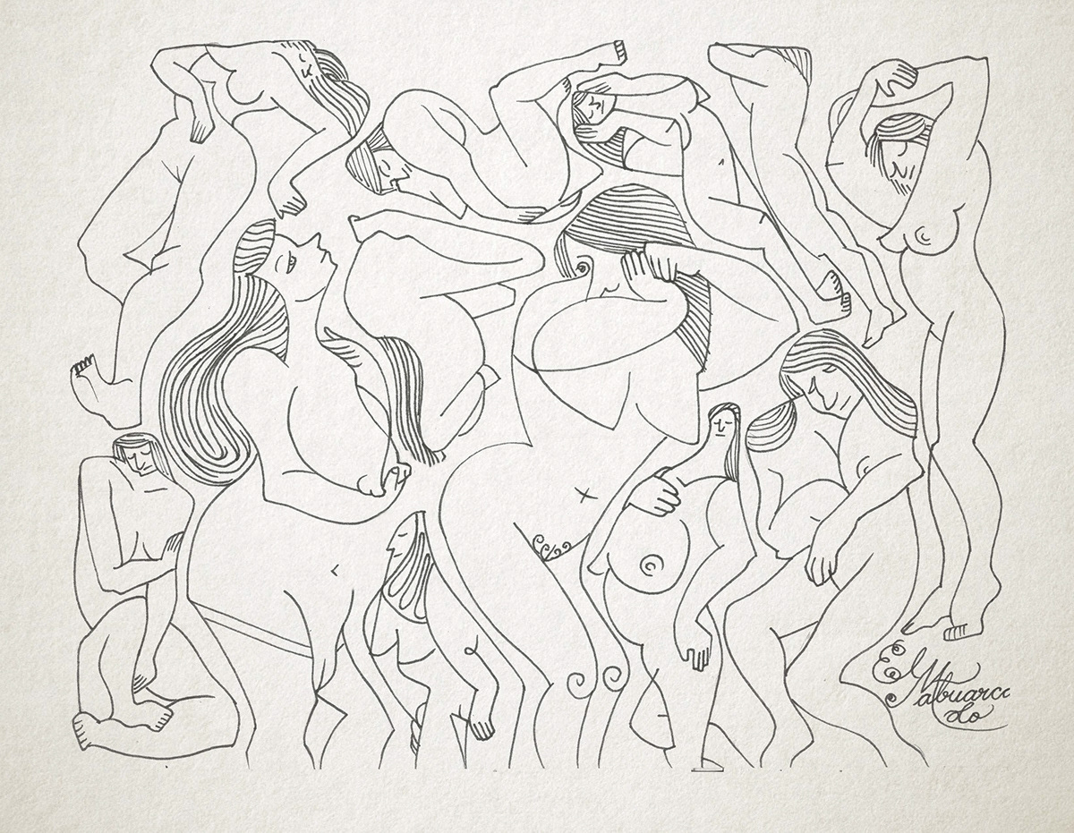 Es entonces cuando el ojo interviene, buscando significado donde antes solo había desorden. Como si siempre hubieran estado ahí, las figuras comienzan a emerger del laberinto de líneas. Cuerpos desnudos, entrelazados en una danza silenciosa, atrapados en una dimensión que solo existe cuando alguien logra verla. La tinta los rescata, definiendo los contornos de su existencia.