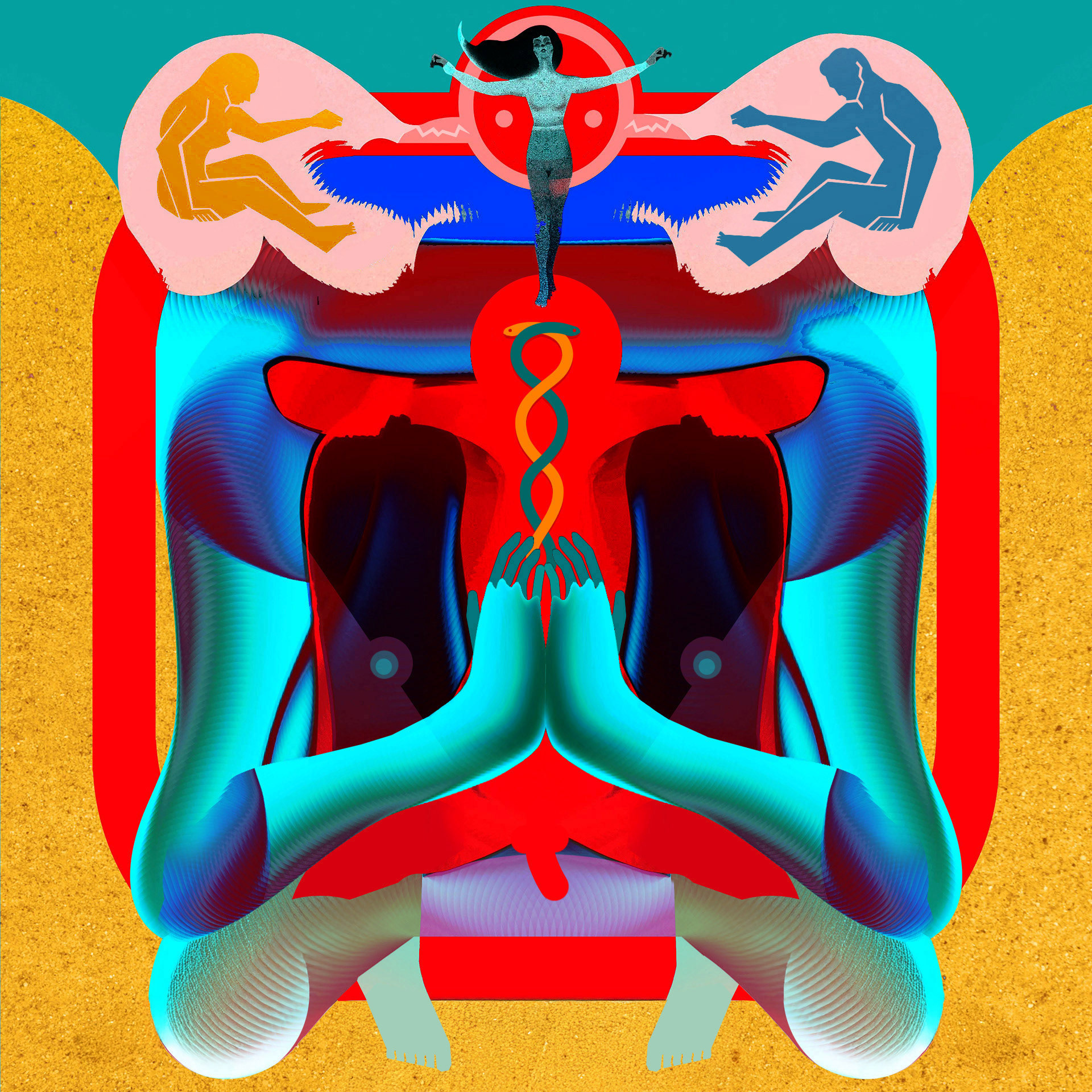 Beneath her, in the belly of the alchemical furnace, two twin guardians with skin of midnight and cyan protect the ascending caduceus—the double serpent that is not venom, but a ladder. Here, in this secret chamber where the jaws of time attempt to devour eternity, the great secret is revealed: that duality is not a war, but a static embrace holding the door through which spirit descends to become matter, guarded by blue hands that pray before the mystery of their own existence.