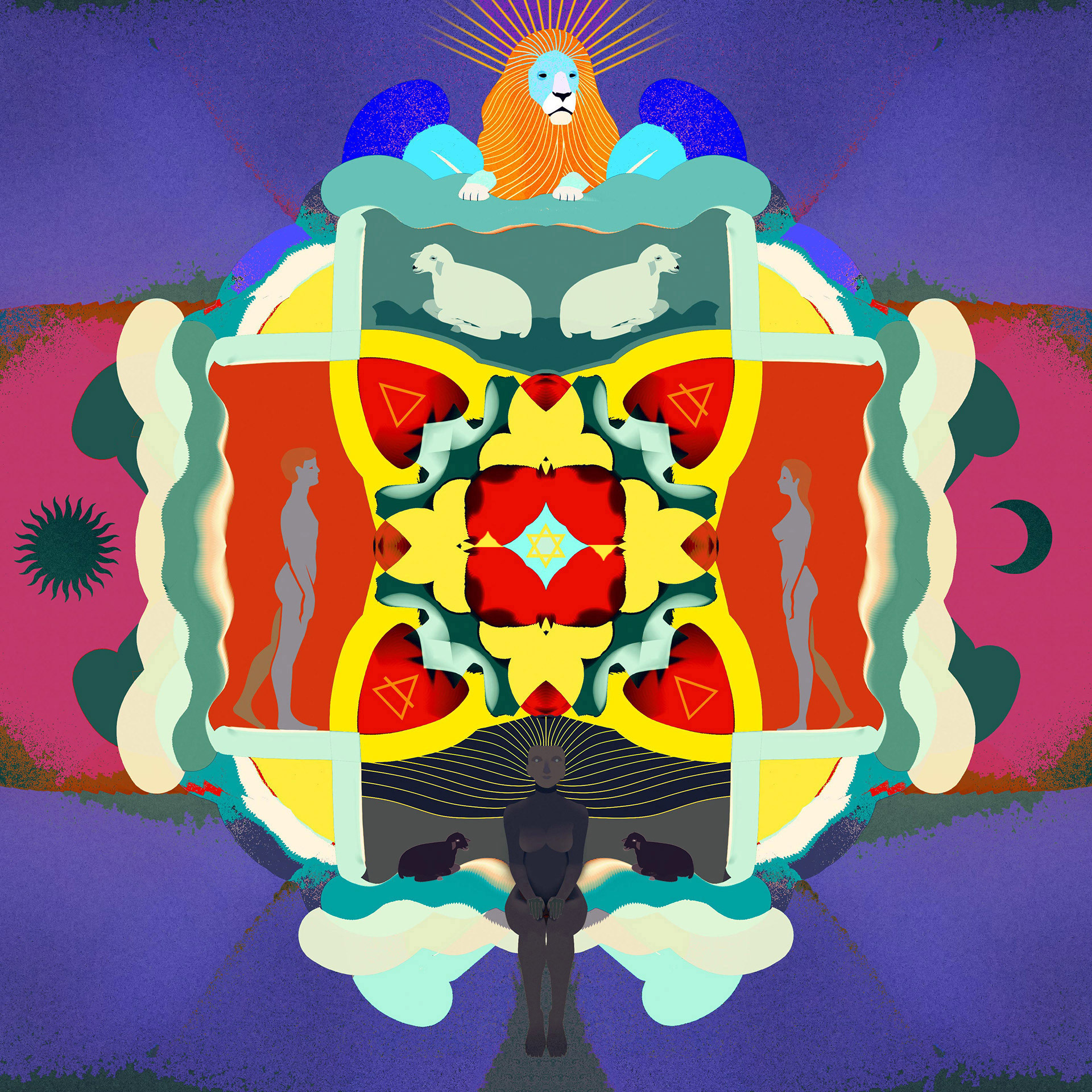 Upon the threshold where silence divides, two primordial architects sit at the edge of the abyss to weave the flesh of the world. They do not look at each other, for their eyes are mirrors turned inward; yet their hands hold the central axis: the great Star Mother, who dances upon the red fire of creation, suspended in the perfect balance between desire and form.